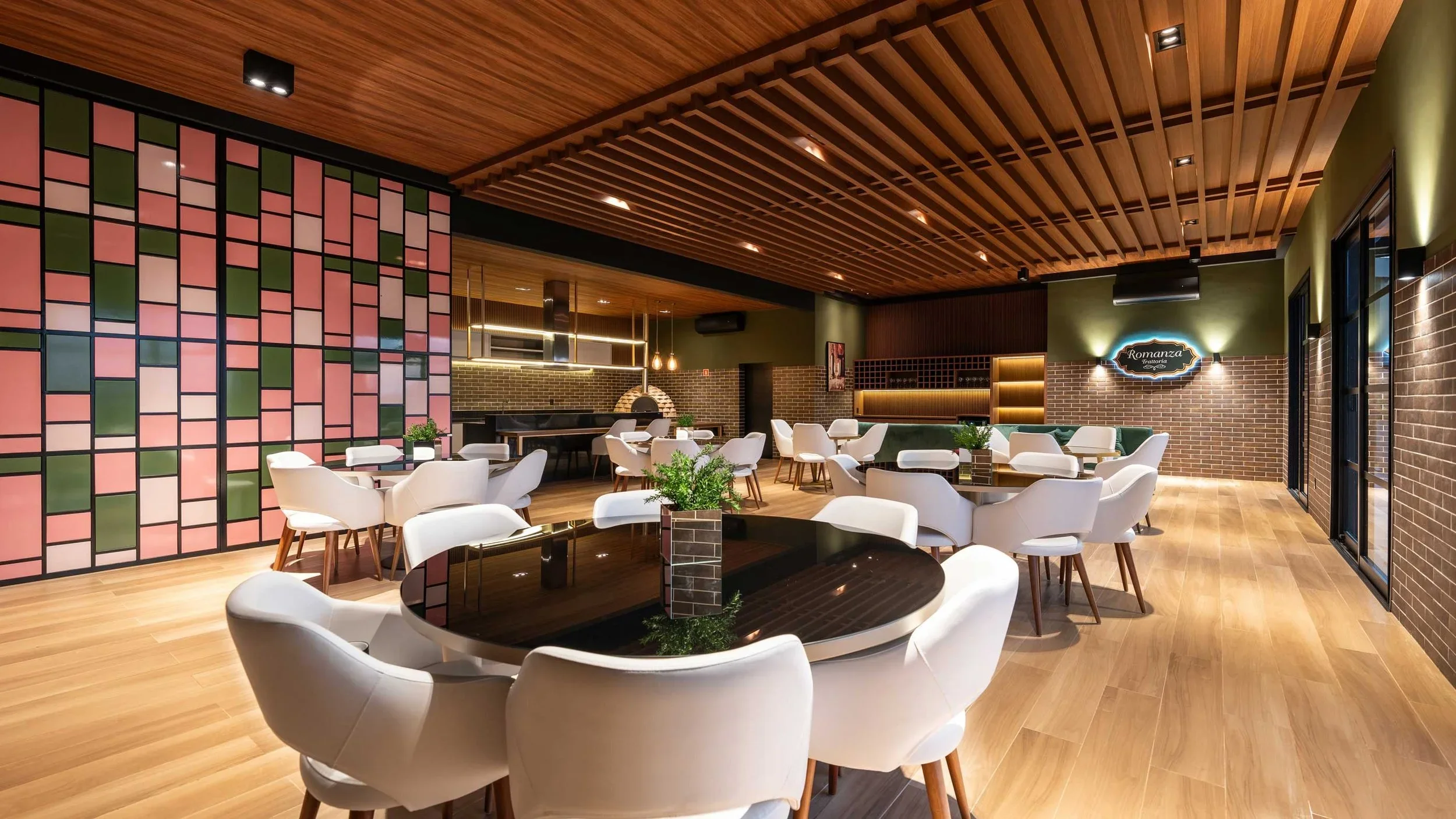 No Espaço Romanza Trattoria, a predominância do verde combinada com tons rosados cria um ambiente sofisticado e acolhedor.