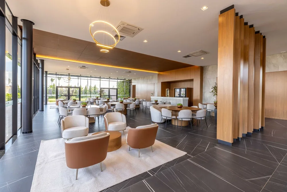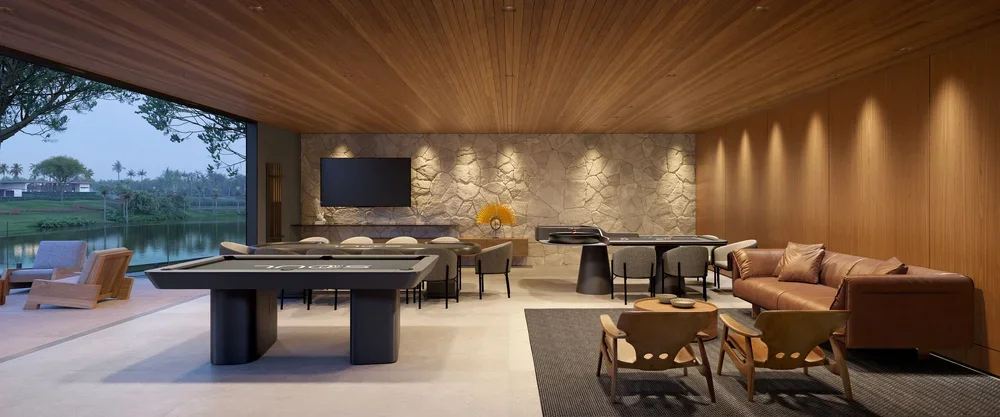 Painéis e revestimentos em madeira criam profundidade visual e ajudam a organizar os ambientes de maneira fluida, sem a necessidade de divisórias rígidas. Essa solução contribui para uma sensação imediata de acolhimento e continuidade.