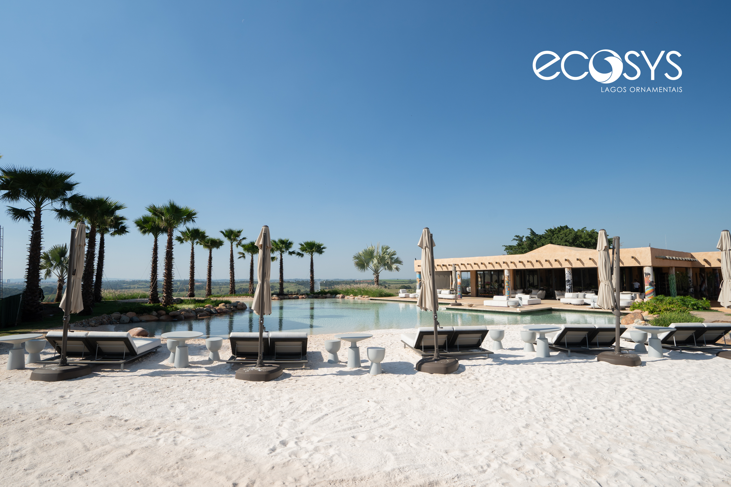 Piscina praia do Soul Corpal Living Resort com design natural e integração ao paisagismo, desenvolvida com tecnologia Ecosys.